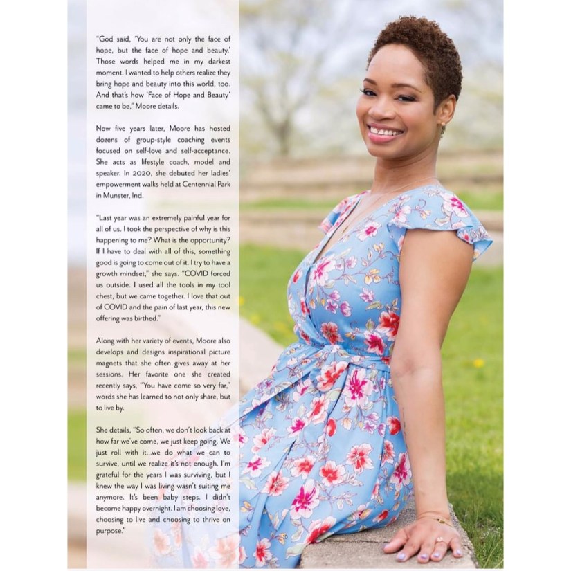 “God said, ‘You are not only the face of hope, but the face of hope and beauty.’ Those words helped me in my darkest moment. I wanted to help others realize they bring hope and beauty into this world, too. And that’s how ‘Face of Hope and Beauty’ came to be,” Moore details.