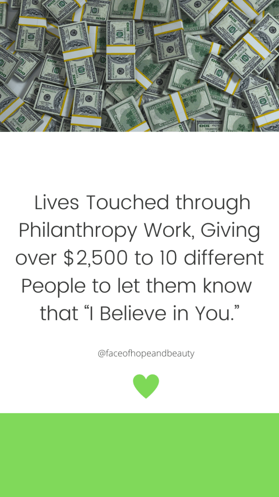 Lives Touched through Philanthropy Work, giving over $2,500 to 10 different People to let them know that “I Believe in You.”